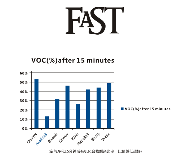 美國知名商業雜志《Fastcompany》聯合權威專家對多個知名品牌空氣凈化器進行了測評, 在《Buyer'sGuide: The best Air Purifier》(消費者指引:最佳空氣凈化器推薦)文章中向消費者推薦奧司汀空氣凈化器是去除氣味、甲醛、VOC等復雜化學氣體污染的最佳選擇。檢測中使用奧司汀健康伴侶標準型HM400與其它品牌在去除VOC(揮發性有機化學氣體)效率的PK中獲得完勝,15分鐘后VOC剩余率12%,遠低于其它品牌機型。