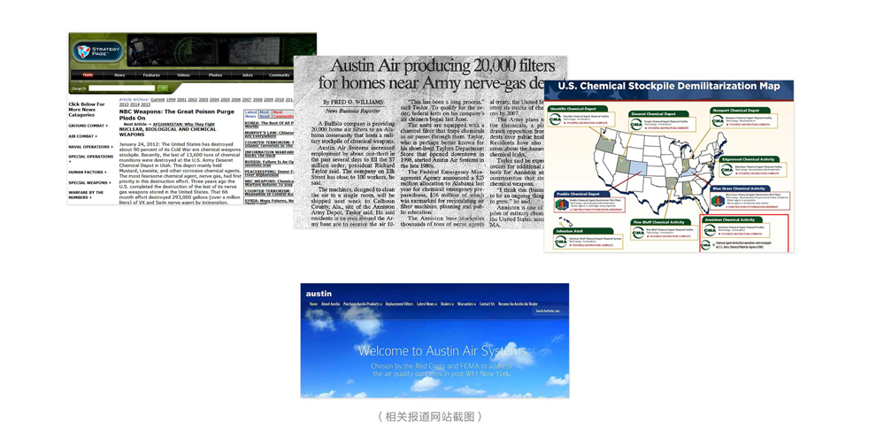 2003年 美國政府根據國際條約,需銷毀Alabama州Anniston軍事基地的上千噸神經毒劑和芥子氣等化學物質。因擔心化學物質可能泄漏帶來的危害,這項計劃受到關注公共健康居民的反對。為此,根據巴特爾紀念研究所的嚴格檢測結果,美國聯邦緊急事務管理局(FEMA)啟動應急計劃,為該軍事基地附近的家庭采購20000臺奧司汀空氣凈化器,以保障居民身體健康。